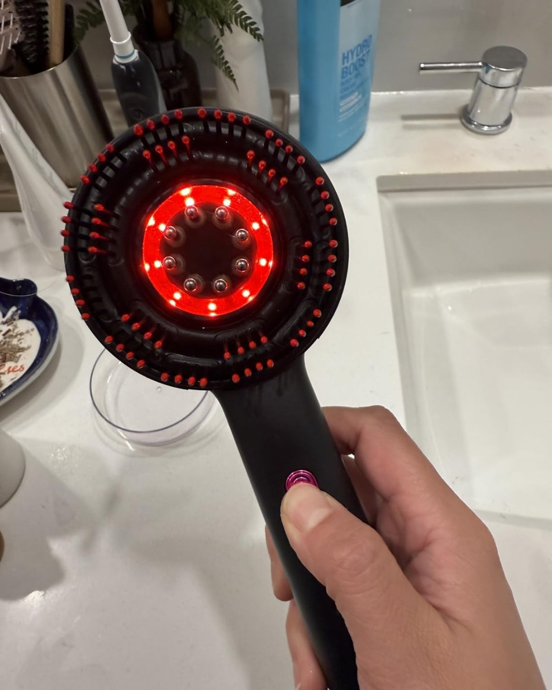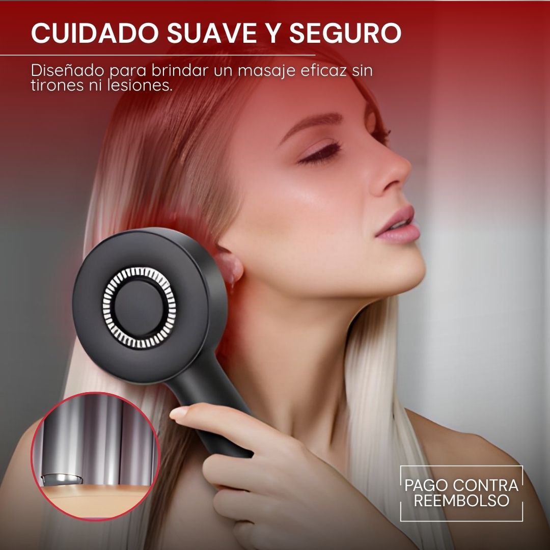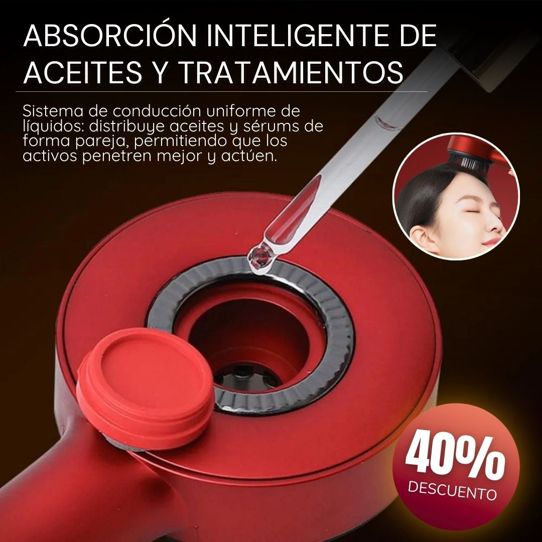 Tecnología de luz roja, masaje inteligente y absorción profunda en un solo dispositivo de cuidado capilar.